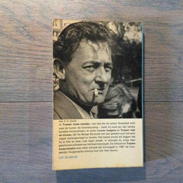 In 'Tussen twee stoelen' - een titel die de auteur illustratief acht voor de humor als levenshouding - heeft hij twee van zijn talrijke bundels microverhalen, te weten 'Louter leugens' en 'Tussen mal en dwaas', die De Bezige Bij zowat tien jaar geleden (sic) voor het eerst uitgaf, samengevoegd en herzien. Het laatste woord wil zeggen dat hij er hier en daar, naar eigen smaak, in schrapte en enige later geschreven schetsen aan het boek toevoegde. de inhoud van 'Tussen twee stoelen' was mede oorzaak dat Carmiggelt in 1961 de Constantijn Huygensprijs ontving voor zijn hele oeuvre...