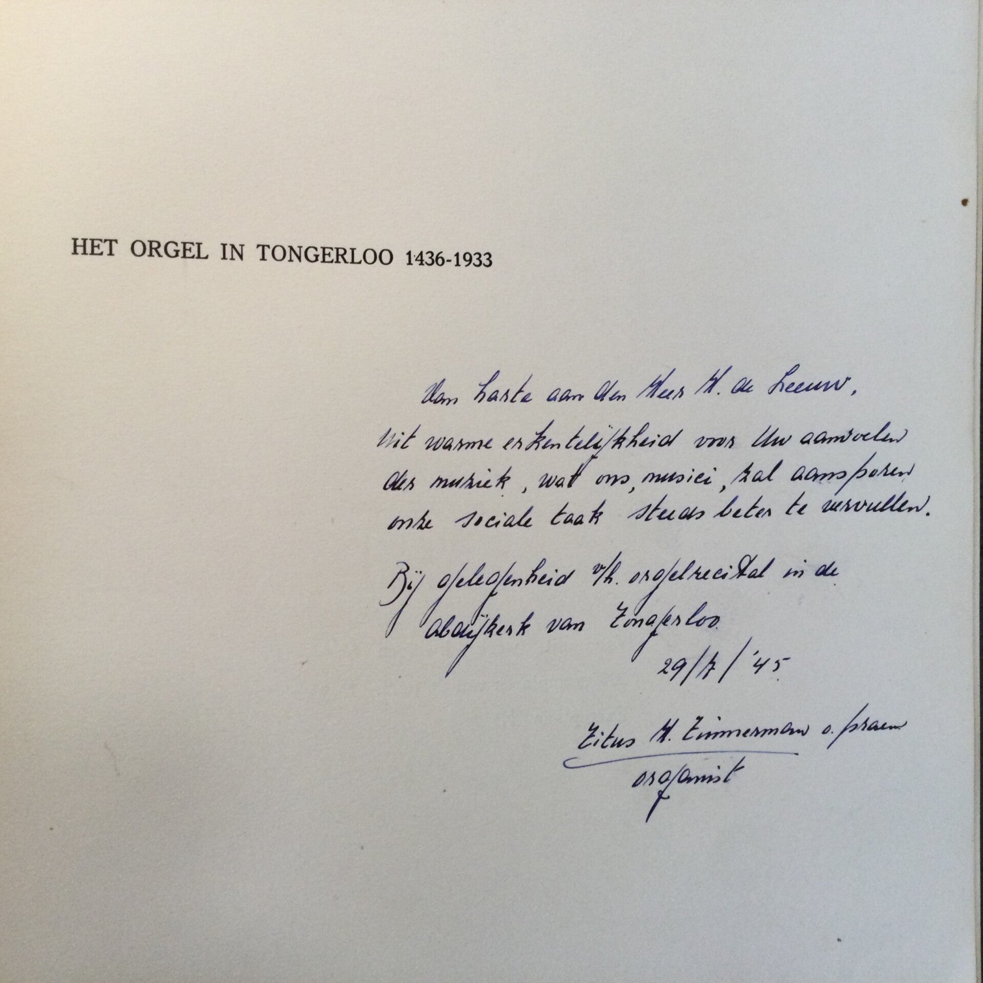 Met opdracht en handtekening van Titus H. Timmermans o. pream, organist!