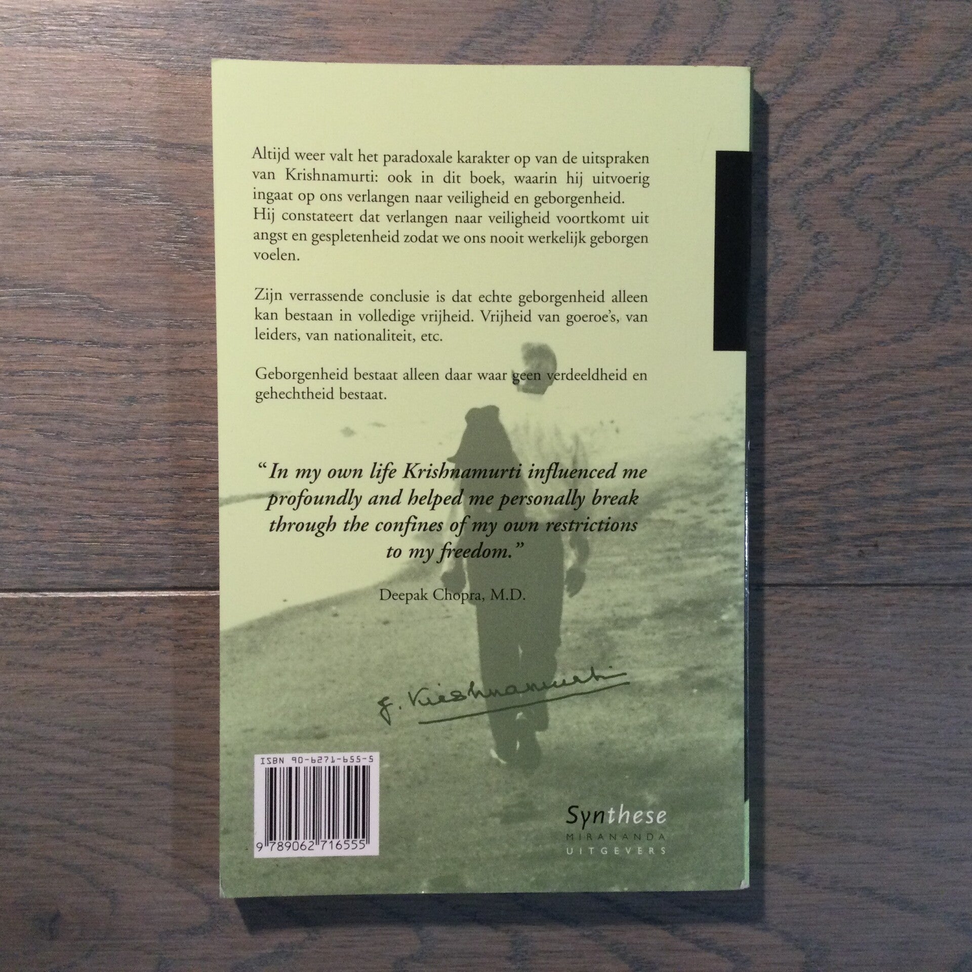 Altijd weer valt het paradoxale karakter op van de uitspraken ban Krishnamurti: ook in dit boek, waarin hij uitvoerig ingaat op ons verlangen naar veiligheid en geborgenheid. Hij constateert dat verlangen naar veiligheid voortkomt uit angst en gespletenheid zodat we ons nooit werkelijk geborgen voelen.
