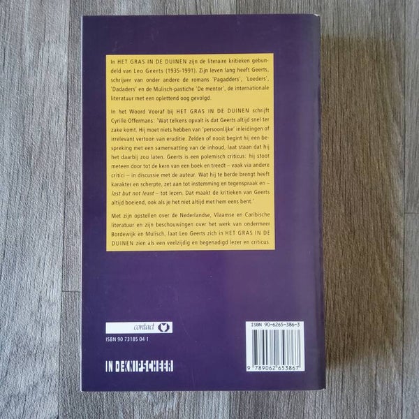 In" het gras in de duinen" zijn de literaire kritieken gebundeld van Leo Geerts (1935-1991)Zijn leven lang heeft de schrijver van onder andere de romans 'pagadders', 'Loeders', 'Dadaders ,en de Mulisch-pastiche ' De Mentor', de internationale literatuur met een oplettend oog gevolgd.