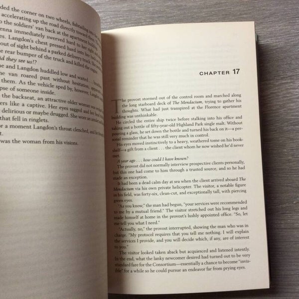 A threat to his life will propel him and a young doctor, Sienna Brooks, into a breakneck chase across the city. Only Langdon's knowledge of the hidden passageways and ancient secrets that lie behind its historic facade can save them from the clutches of their unknown pursuers.