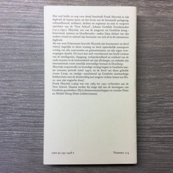 Met veel liefde en oog voor detail beschrijft Frank Meyrink in zijn dagboek de laatste jaren uit het leven van de beroemde pedagoog, cultuurfilosoof, architect, dichter en regisseur en niet te vergeten oprichter van de 'New School', Johann Gottlieb Freudenacker. Meyrink, een van de jongeren uit Gottliebs kring -huisvriend, intimus en bloedbroeder- raakte bijna idolaat van zijn oudere vriend en schreef fascinatie van zich af in dit minutieuze dagboek...